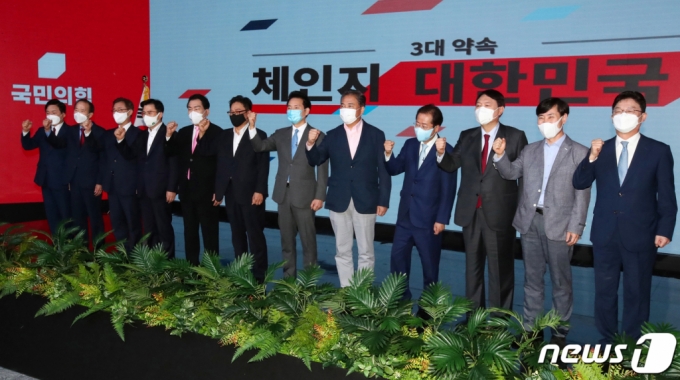 | 7일 오후 서울 강서구 ASSA빌딩 방송스튜디오에서 열린 국민의힘 대선 경선 후보 '체인지 대한민국, 3대 약속' 발표회에서 12명의 대선주자들이 나란히 포즈를 취하고 있다. 왼쪽부터 원희룡, 장기표, 최재형, 황교안, 안상수, 박찬주, 장성민, 박진, 홍준표, 윤석열, 하태경, 유승민 예비후보. /사진=뉴스1 |