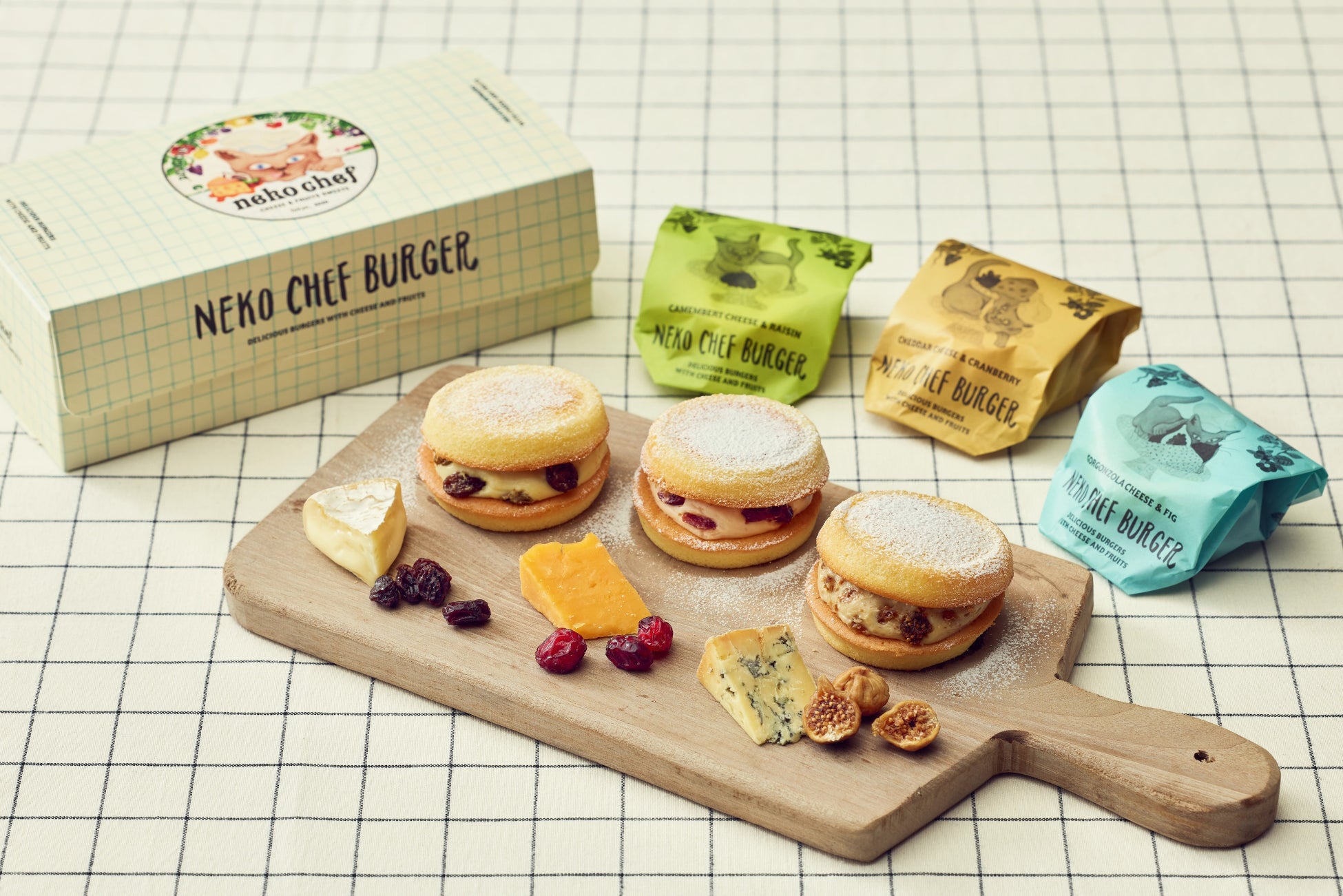ネコシェフの自信作。チーズフルーツバーガー。ご主人自慢のチーズの薫りと森の果実を贅沢に使用し、クリームチーズを練り込んだしっとり生地でサンドしました。
