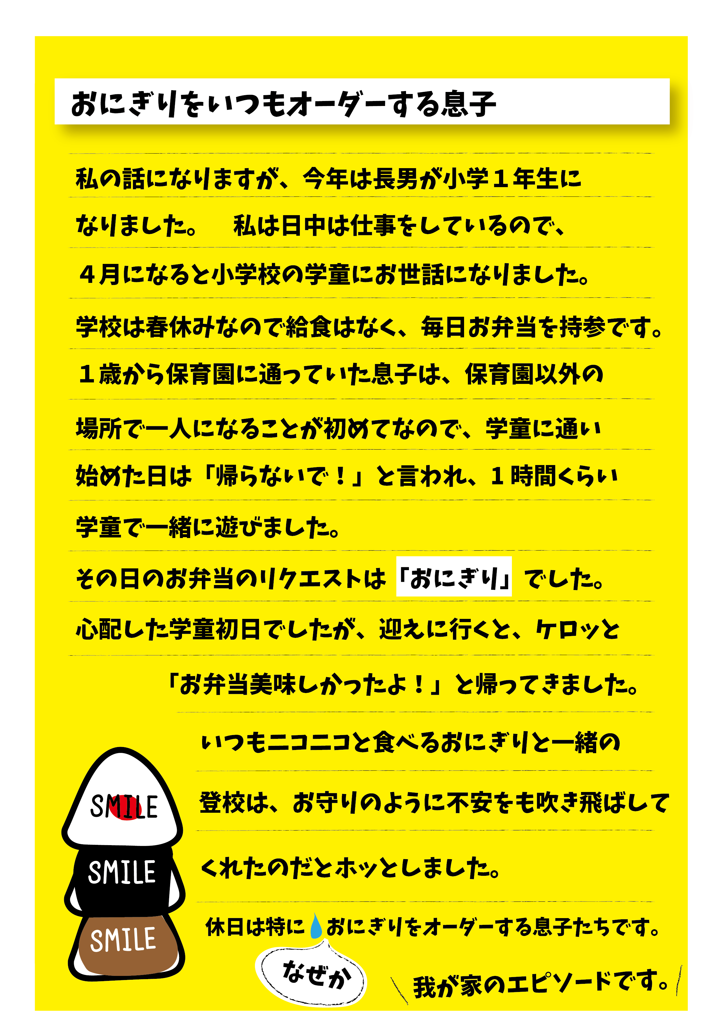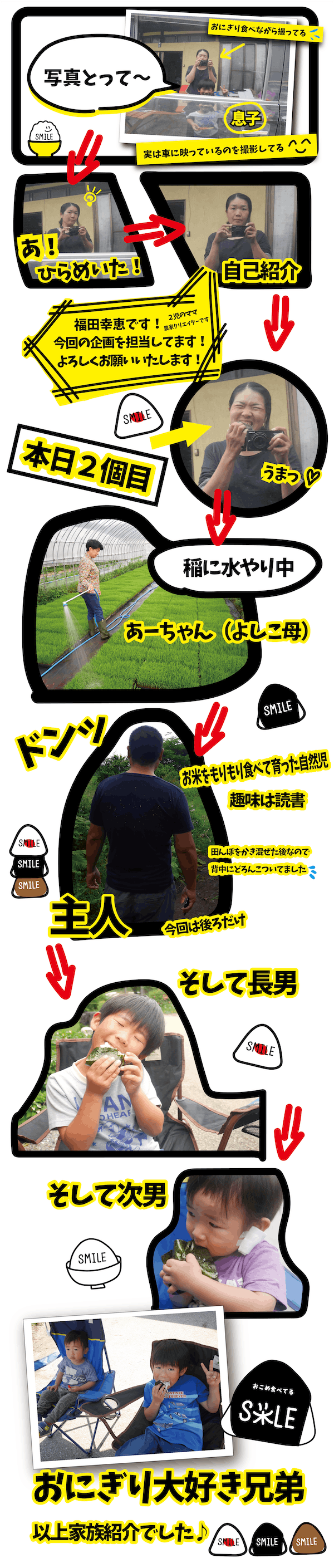 私は、これから先も我が家の美味しいお米を食べていただきたいし、食べ続けていきたいと思います。どうか一度美味しいお米、スマイル米でおにぎりを握って、目を閉じてパクっと食べてみてください!きっと、この美味しさと真面目に米作りに取り組んできたことが伝わると私は思います。